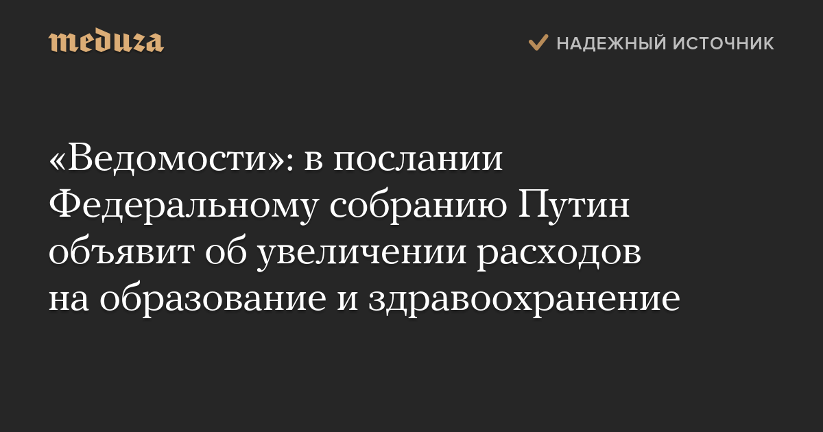 «Ведомости»: в послании Федеральному собранию Путин объявит об увеличении расходов на образование и здравоохранение