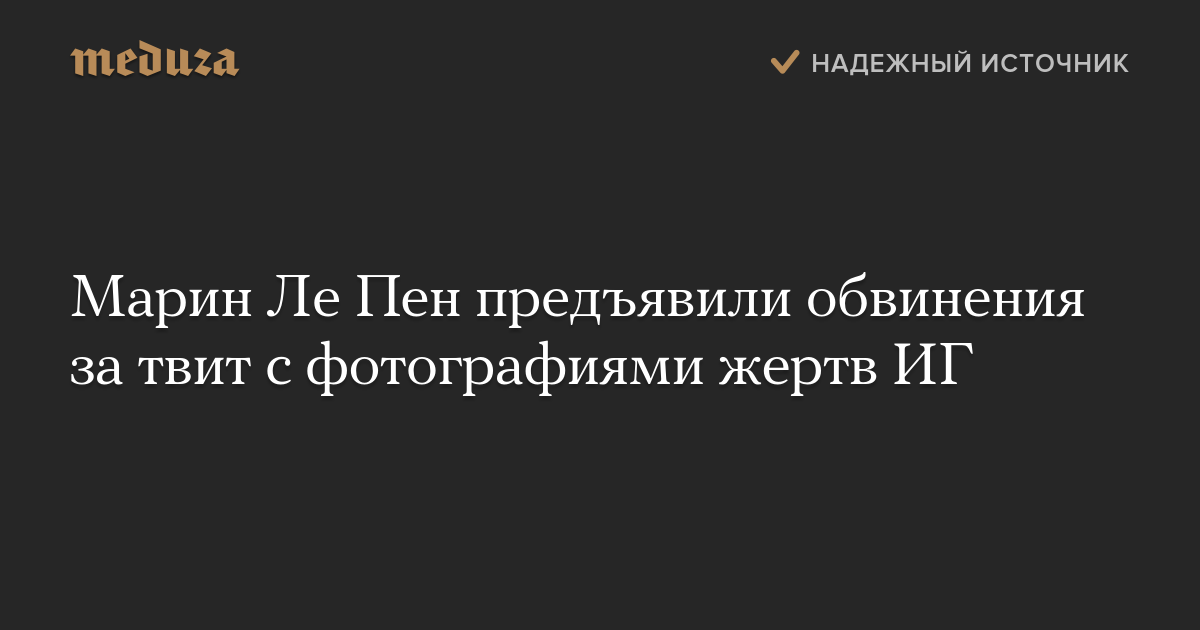 Поводом для предъявления обвинений стали три фотографии, которые Ле Пен опубликовала в своем твиттере в 2015 году. На фото были изображены люди, убитые боевиками «Исламского государства»; снимки сопровождала подпись «Вот это — ИГ». Таким образом Ле Пен отреагировала на слова французского журналиста Жан-Жака Бурдена, сравнившего «Национальный фронт» с ИГ.
