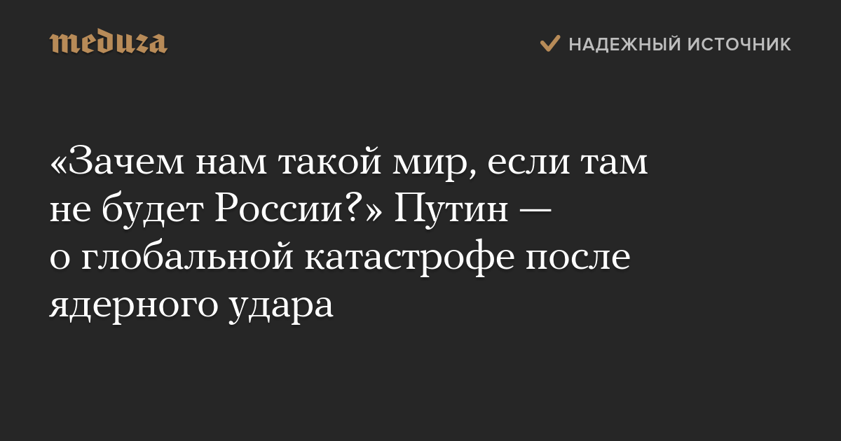 «Да, для человечества это будет глобальная катастрофа, для мира будет глобальная катастрофа. Но я как гражданин России и глава российского государства хочу задаться вопросом: а зачем нам такой мир, если там не будет России?» — сказал Путин.