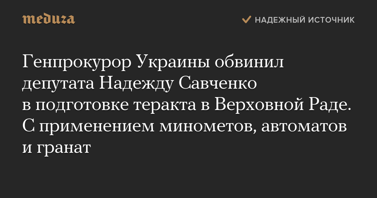 Генпрокурор Украины обвинил депутата Надежду Савченко в подготовке теракта в Верховной Раде. С применением минометов, автоматов и гранат