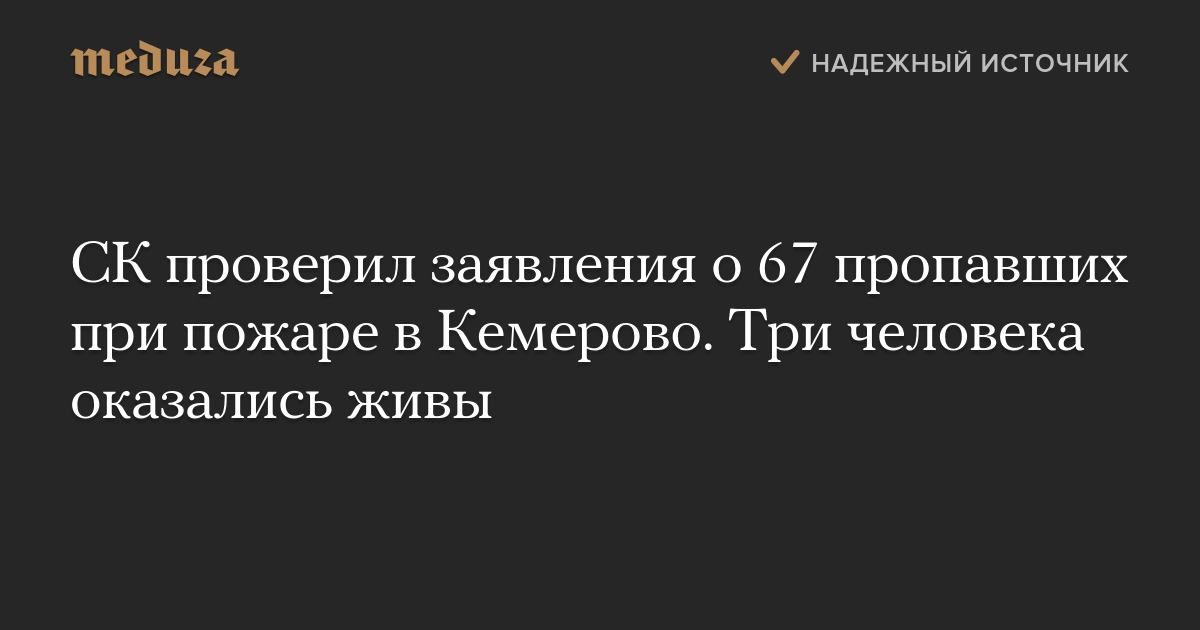 Три человека, числившихся пропавшими без вести при пожаре в Кемерово, обнаружены живыми, сообщил Следственный комитет РФ.