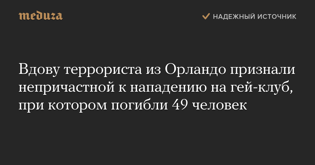 Суд признал Нур Салман, вдову террориста Омара Матина, убившего 49 человек в гей-клубе Pulse в Орландо, непричастной к преступлению. Об этом сообщает Associated Press.