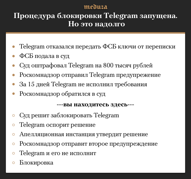 «Позиция Telegram остается прежней: требования ФСБ предоставить доступ к частной переписке пользователей неконституционны, не основаны на законе, технически и юридически неисполнимы, следовательно, требование блокировки также необоснованно», — сообщил глава «Агоры» Павел Чиков. Правозащитники представляют интересы мессенджера в спорах с российскими ведомствами.
