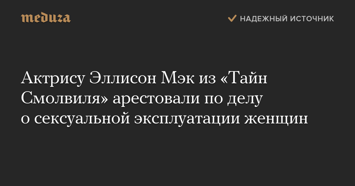 Актрису Эллисон Мэк из «Тайн Смолвиля» арестовали по делу о сексуальной эксплуатации женщин