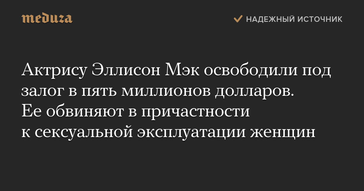 Актрису Эллисон Мэк освободили под залог в пять миллионов долларов. Ее обвиняют в причастности к сексуальной эксплуатации женщин