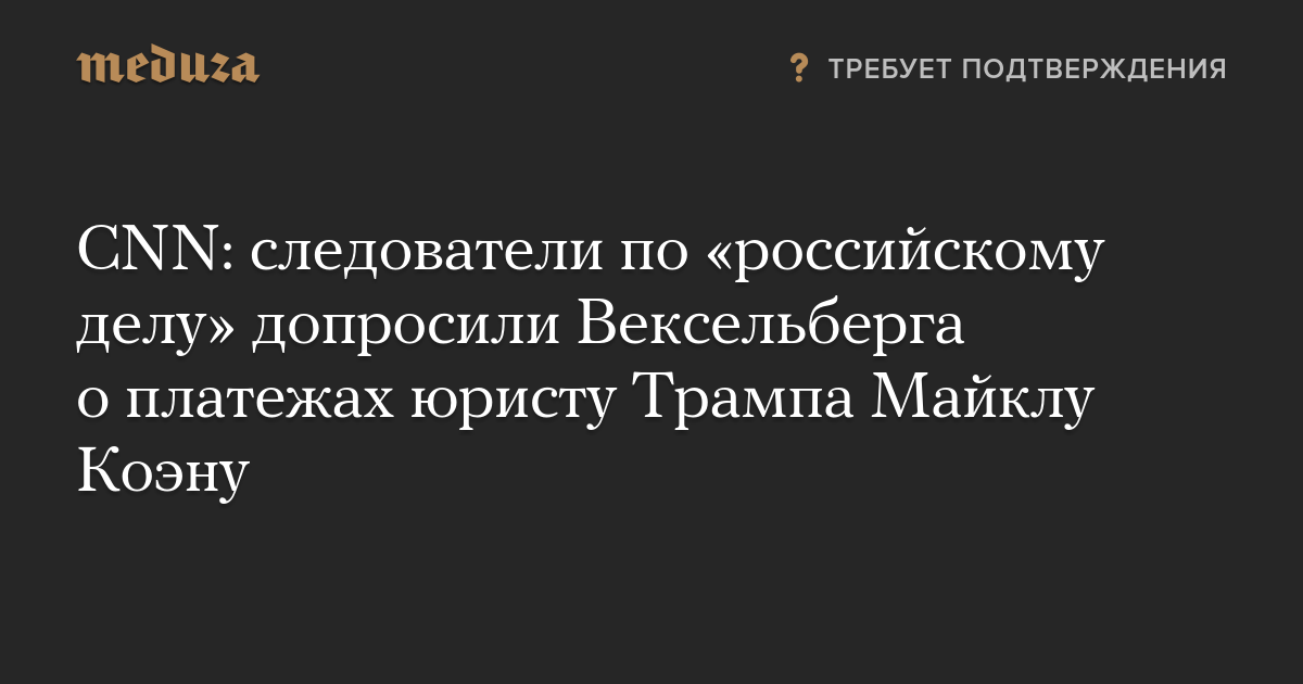 Команда спецпрокурора Роберта Мюллера, расследующая предполагаемое вмешательство России в американские выборы, допросила владельца группы «Ренова», миллиардера Виктора Вексельберга о деньгах, которые связанная с бизнесменом фирма переводила на счета юриста Дональда Трампа Майкла Коэна. Об этом сообщает CNN со ссылкой на источник.