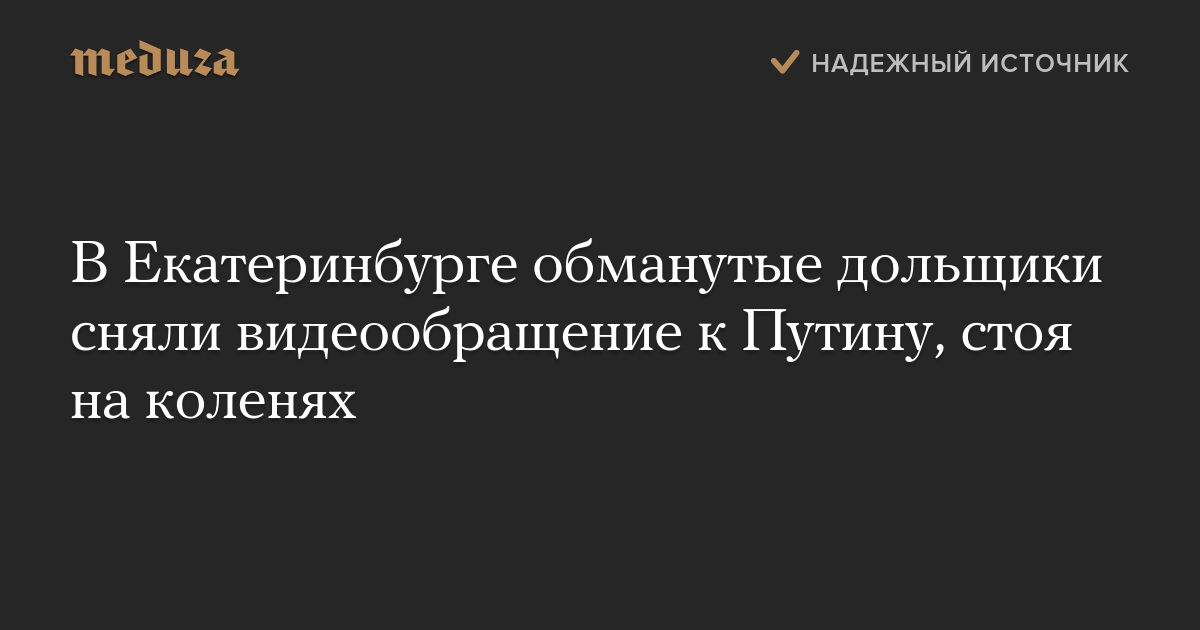 В Екатеринбурге группа обманутых дольщиков записала видеообращение к президенту России Владимиру Путину с просьбой о помощи. В конце ролика они со словами «Господин президент, помогите нам» встали на колени.