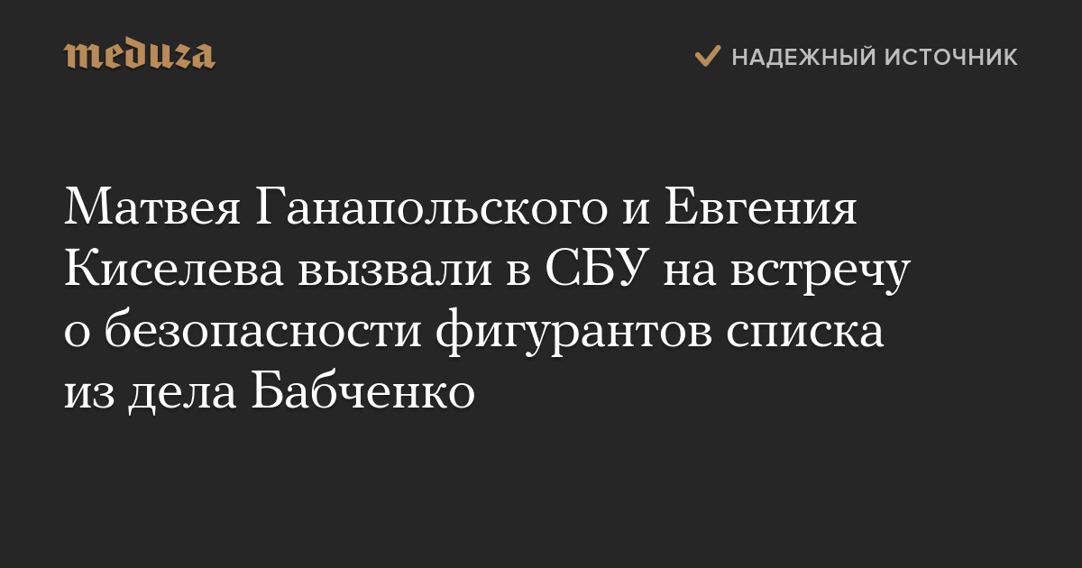 Живущие на Украине журналисты Матвей Ганапольский и Евгений Киселев рассказали, что 1 июня были вызваны в Службу безопасности Украины на встречу по вопросам безопасности людей, которых предположительно хотят убить заказчики покушения на журналиста Аркадия Бабченко.