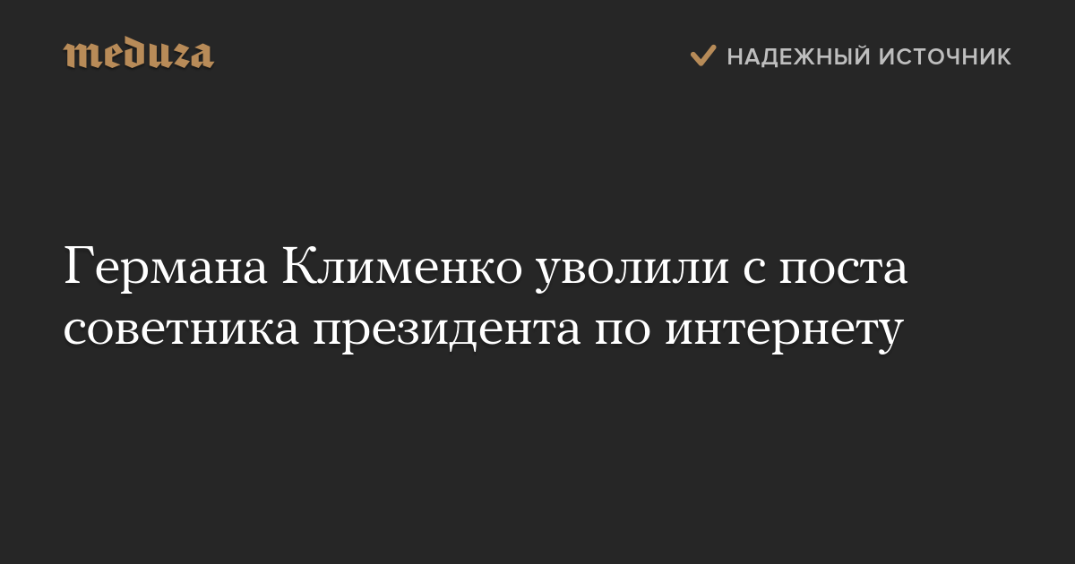 Герман Клименко освобожден от должности советника президента РФ по программам развития интернета. Указ об этом опубликован на сайте Кремля. Эту должность Клименко занимал с января 2016 года.