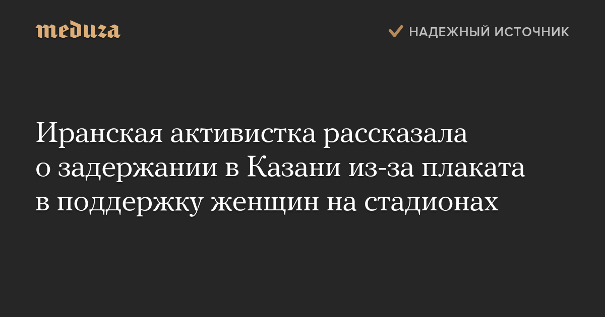 Иранская активистка Марьям Кашкаэй рассказала, что 20 июня ее задержали в Казани перед матчем Ирана с Испанией из-за плаката в поддержку права иранских женщин ходить на стадионы.