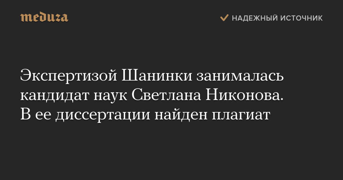 Экспертизой Шанинки занималась кандидат наук Светлана Никонова. В ее диссертации найден плагиат
