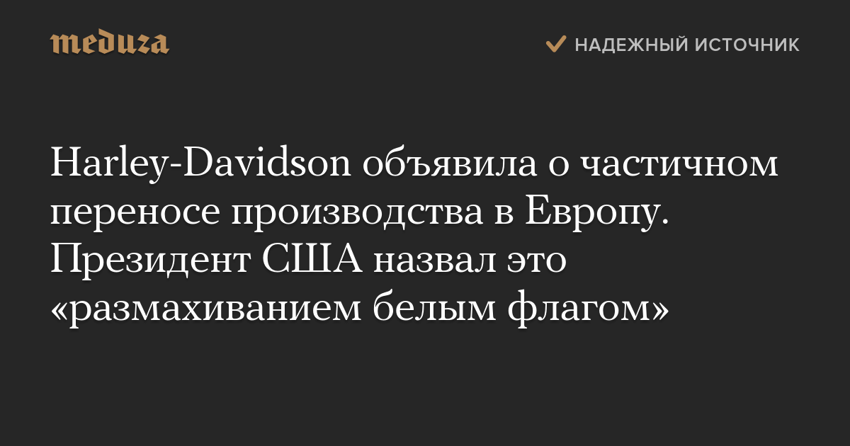 Президент США Дональд Трамп, комментируя планы Harley-Davidson перенести часть производства в Европу, заявил, что производитель мотоциклов стала первой американской компанией, которая «размахивает белым флагом».