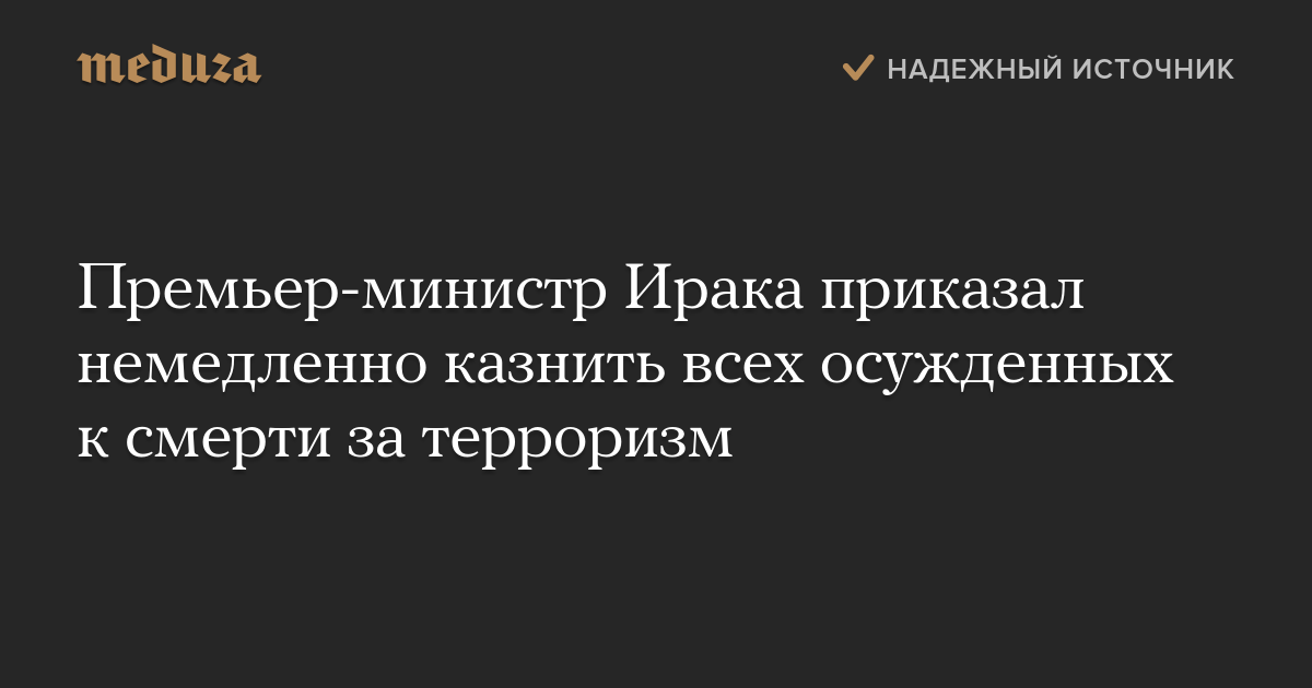 Премьер-министр Ирака Хайдер Аль-Абади 28 июня приказал «немедленно» казнить всех осужденных к смерти по обвинениям в терроризме. Об этом 28 июня сообщило агентство AFP.