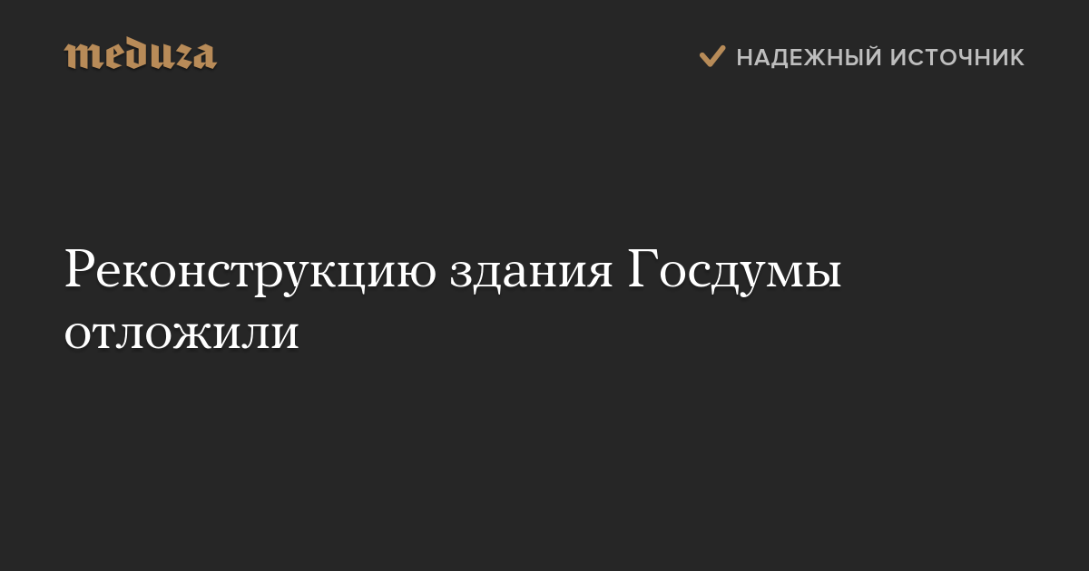 Реконструкция здания Госдумы РФ, планировавшаяся на лето 2018 года, переносится на более поздний срок — зимние каникулы или 2019 год, сообщает «Коммерсант».
