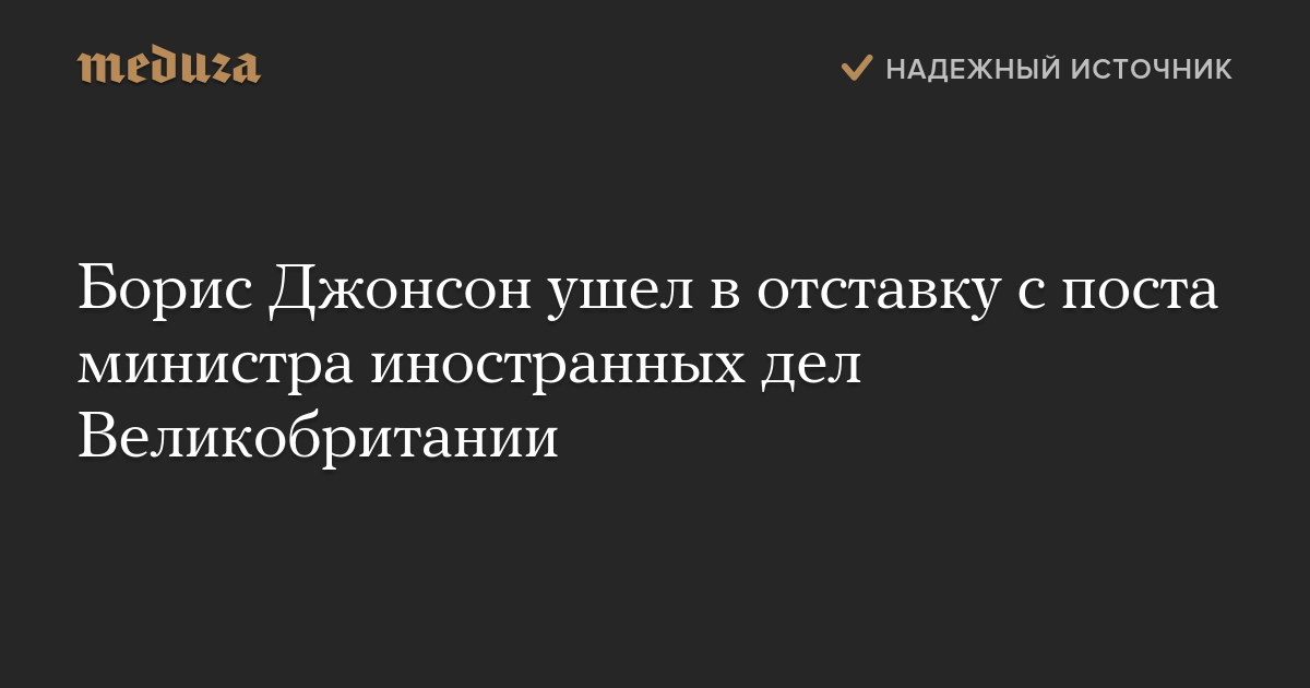 «Сегодня премьер-министр [Тереза Мэй] приняла отставку Бориса Джонсона с должности министра иностранных дел. О его преемнике будет объявлено в ближайшее время. Премьер-министр благодарит Бориса за его работу», — заявил официальный представитель Даунинг-Стрит (англ.яз.).
