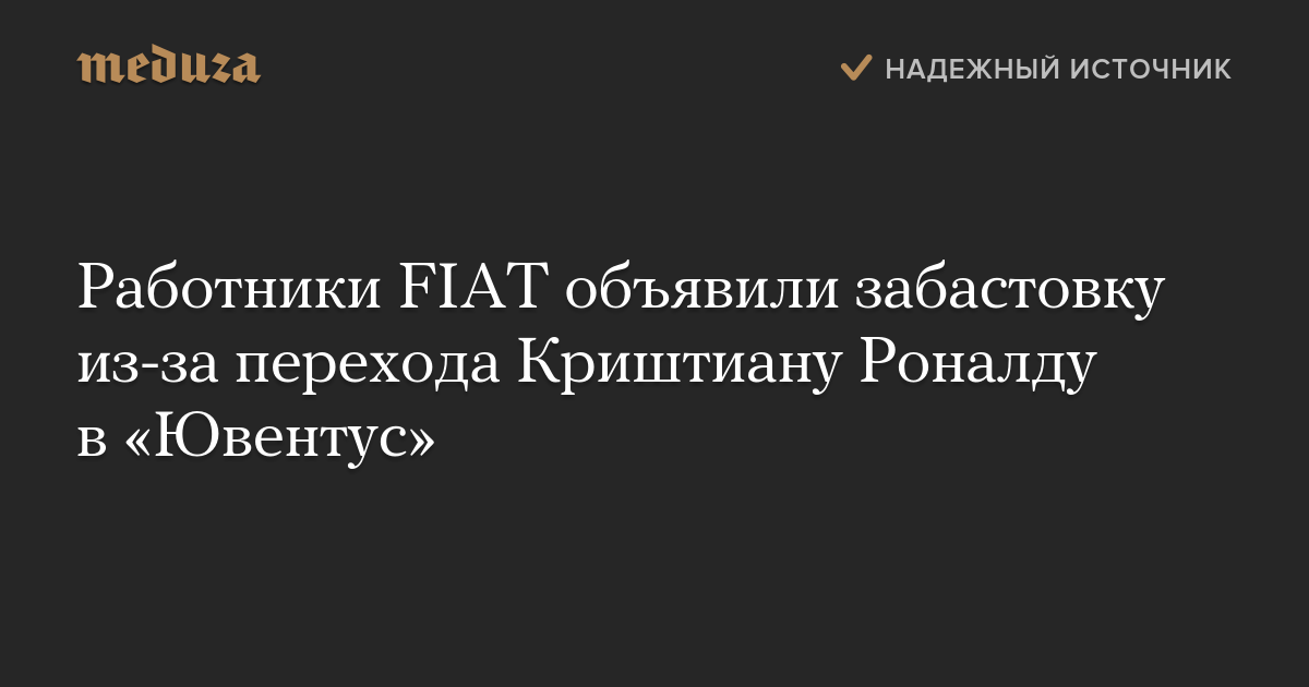 Работники завода FIAT в коммуне Мельфи в Италии проведут забастовку из-за перехода португальца Криштиану Роналду в «Ювентус». По данным итальянской прессы, часть денег за трансфер игрока перечислит холдинг Exor, которому принадлежит FIAT.