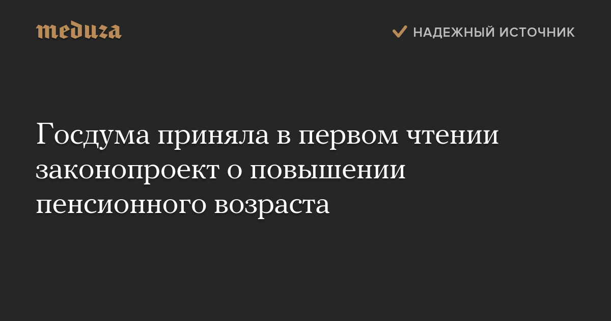 Госдума приняла в первом чтении законопроект о повышении пенсионного возраста в России. Трансляция заседания идет на сайте палаты.