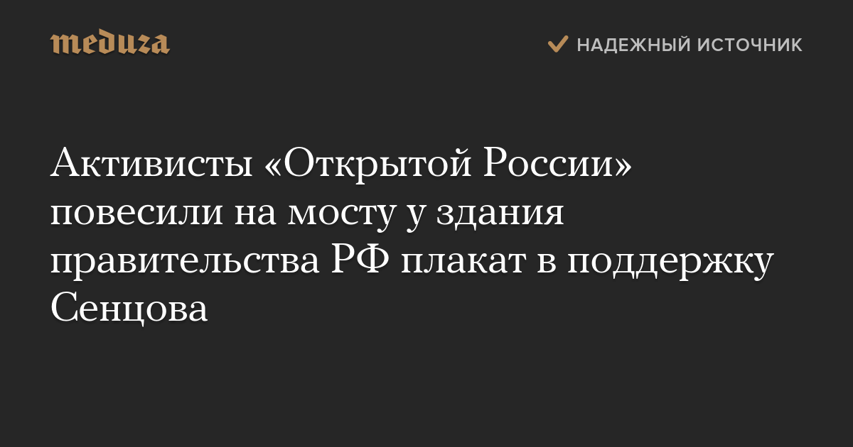 Активисты «Открытой России» повесили на Новоарбатском мосту около здания правительства РФ плакат в поддержку Олега Сенцова, сообщает «МБХ Медиа» в твиттере.