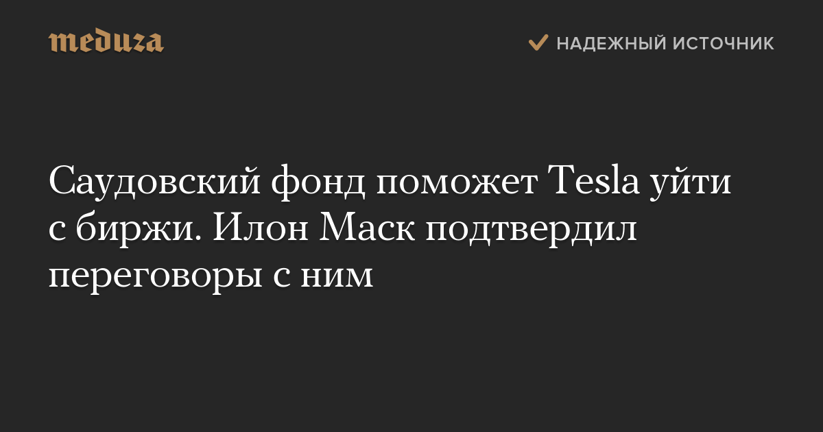 «Саудовский суверенный фонд обращался ко мне неоднократно», — написал Маск. Он рассказал, что несколько раз встречался с представителями организации и что у нее есть «достаточный капитал». При этом основатель Tesla отметил, что ведет переговоры и с другими инвесторами.