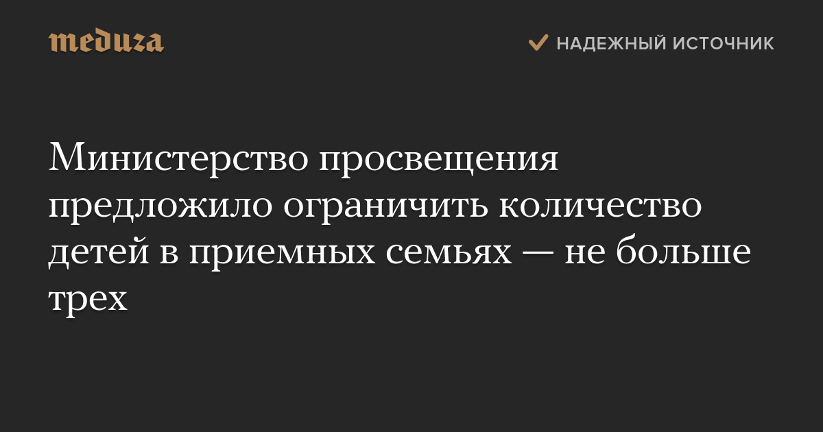 Министерство просвещения подготовило законопроект о сокращении допустимого числа детей в приемных семьях до трех. Об этом сообщает агентство ТАСС, в распоряжении которого оказался документ; официально он пока не опубликован.