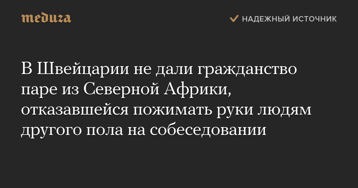 Власти Лозанны отказались дать швейцарское гражданство паре из Северной Африки, которая на собеседовании в комиссии по натурализации не стала отвечать на вопросы людей другого пола и пожимать им руки.