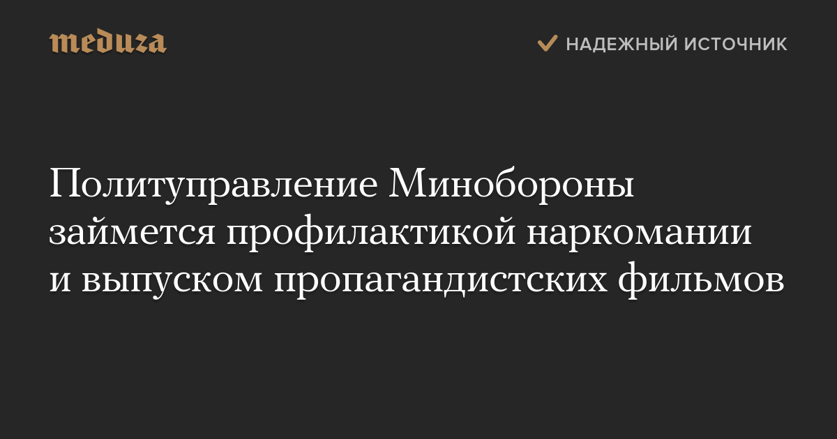 Политуправление Минобороны займется профилактикой наркомании и выпуском пропагандистских фильмов