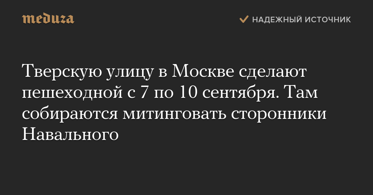 Тверскую улицу в Москве сделают пешеходной с 7 по 10 сентября. Там собираются митинговать сторонники Навального