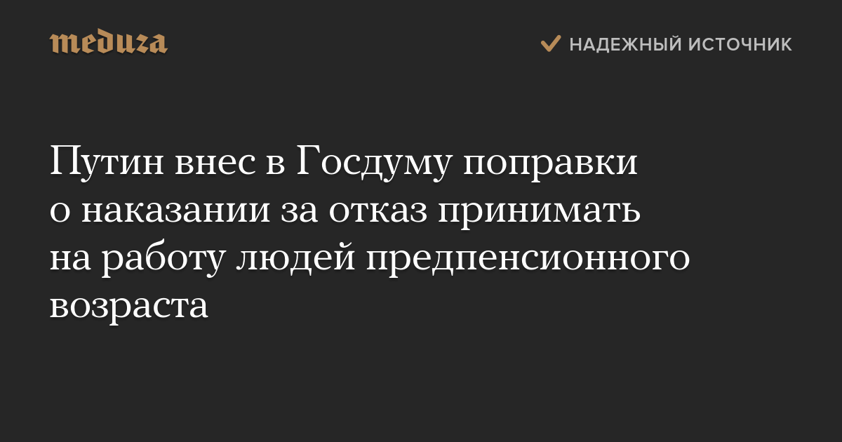 Путин внес в Госдуму поправки о наказании за отказ принимать на работу людей предпенсионного возраста