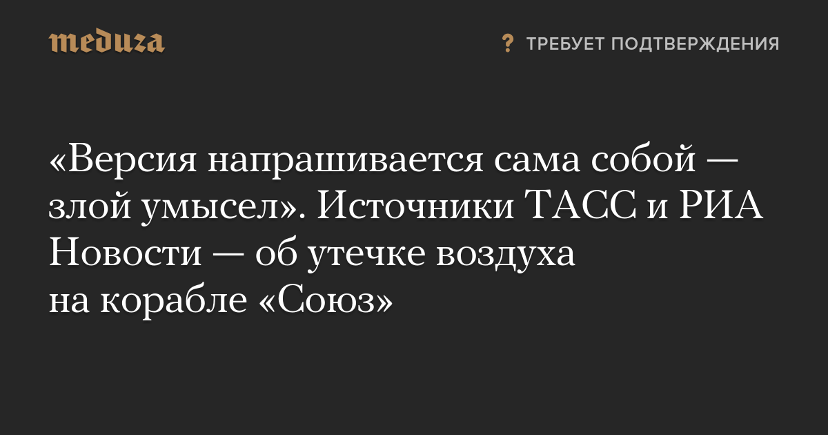 «Версия напрашивается сама собой — злой умысел». Источники ТАСС и РИА Новости — об утечке воздуха на корабле «Союз»