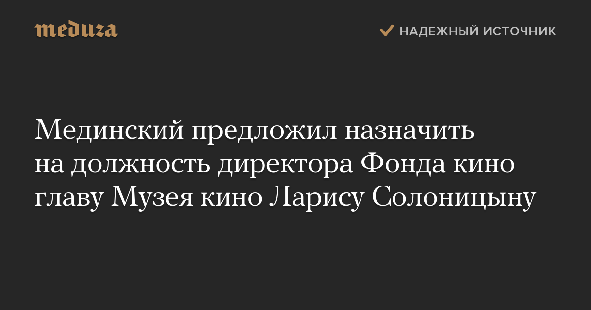 Министр культуры Владимир Мединский предложил правительству назначить на должность директора Фонда кино киноведа Ларису Солоницыну, которая с 2014 года руководит Музеем кино. Об этом «Медузе» сообщили источники, близкие к фонду и Минкульту.