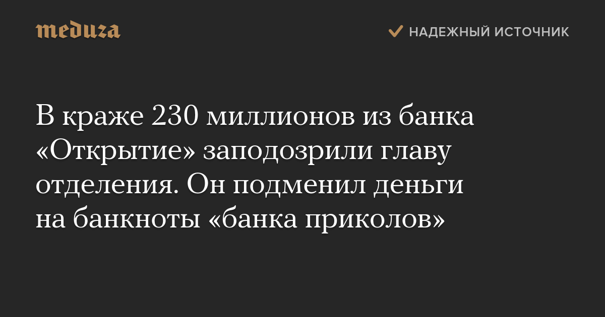 В краже 230 миллионов из банка «Открытие» заподозрили главу отделения. Он подменил деньги на банкноты «банка приколов»