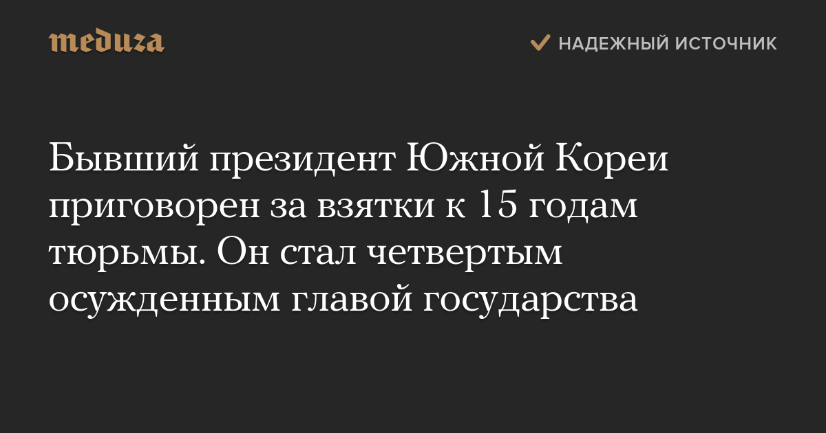 Бывший президент Южной Кореи приговорен за взятки к 15 годам тюрьмы. Он стал четвертым осужденным главой государства