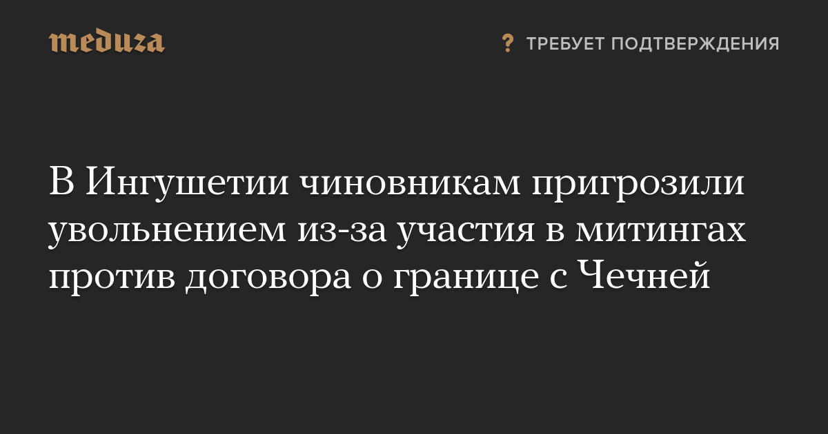 В Ингушетии сотрудникам одного из ведомств пригрозили увольнением за участие в акциях протеста против подписания соглашения о границе с Чечней, сообщает «Интерфакс» со ссылкой на источник.