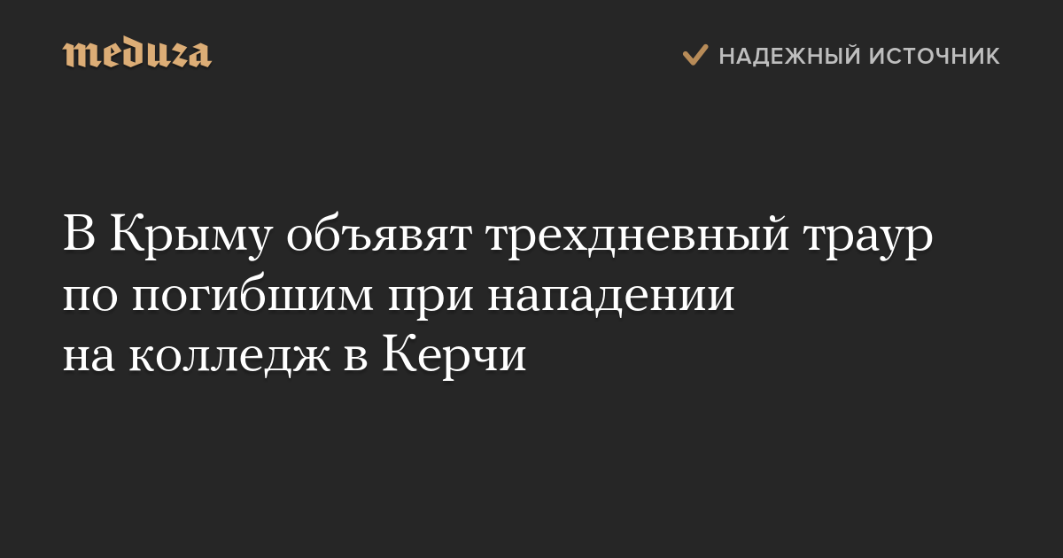 Власти Крыма объявят с 18 октября трехдневный траур в связи с терактом в колледже в Керчи, сообщил в фейсбуке глава Крыма Сергей Аксенов. Он выразил соболезнования родным и близким погибших.