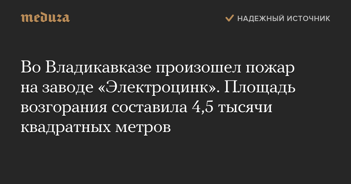 На заводе «Электроцинк» во Владикавказе произошел пожар. Его площадь составила 4,5 тысячи квадратных метров. Пожар, который начался в 3:16 утра воскресенья, был локализован спустя 10 часов. Работа всего завода была приостановлена.
