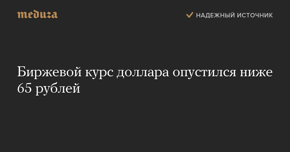 Курс доллара США незадолго до закрытия торгов на Московской бирже кратковременно опустился ниже 65 рублей. Это произошло впервые с 1 октября.
