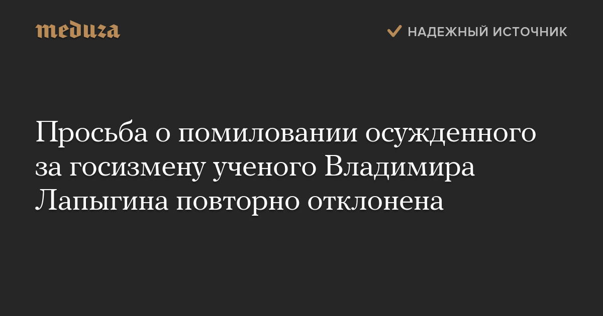 По данным издания, комиссия не нашла «обстоятельств, имеющих существенное значение для применения акта помилования» в отношении Лапыгина и рекомендовала президенту России Владимиру Путину отклонить соответствующее прошение.