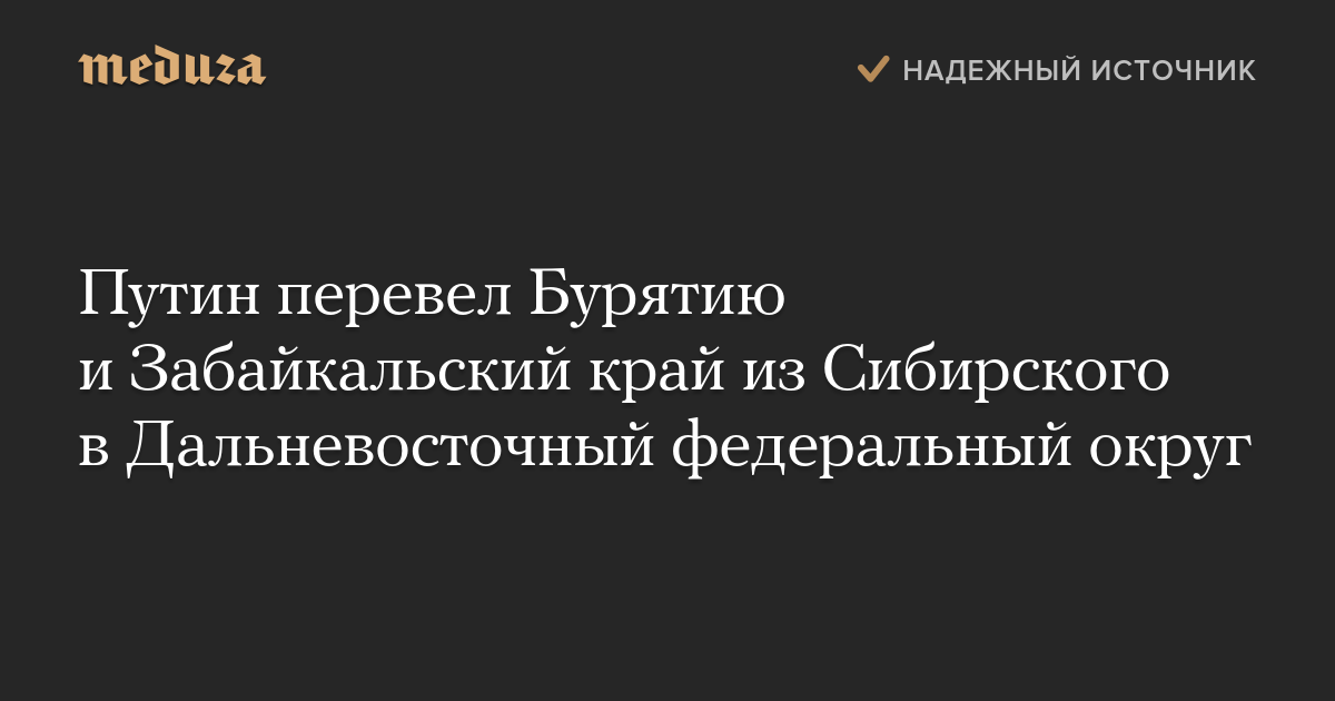 Бурятия и Забайкальский край переведены из состава Сибирского федерального округа в состав Дальневосточного федерального округа. Такой указ подписал президент России Владимир Путин.