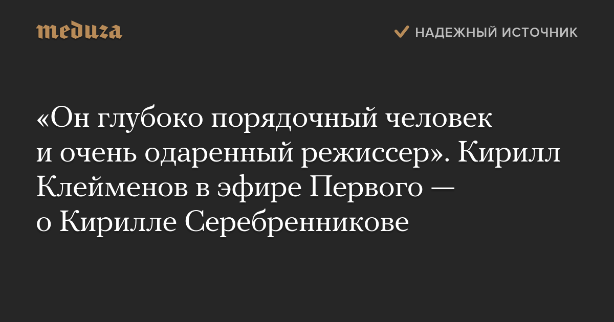 Заместитель гендиректора Первого канала, телеведущий Кирилл Клейменов в эфире вечерней программы «Время» назвал Кирилла Серебренникова, обвиняемого в хищениях, «глубоко порядочным человеком и очень одаренным режиссером».