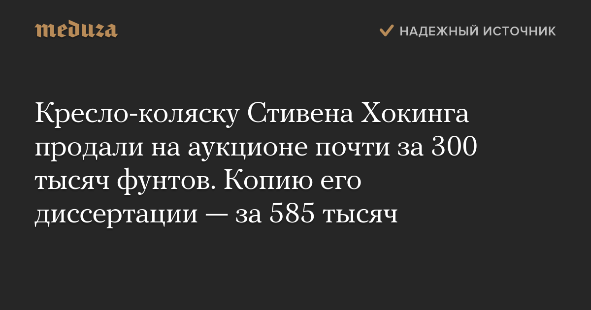 Кресло-коляску Стивена Хокинга продали на аукционе почти за 300 тысяч фунтов. Копию его диссертации — за 585 тысяч