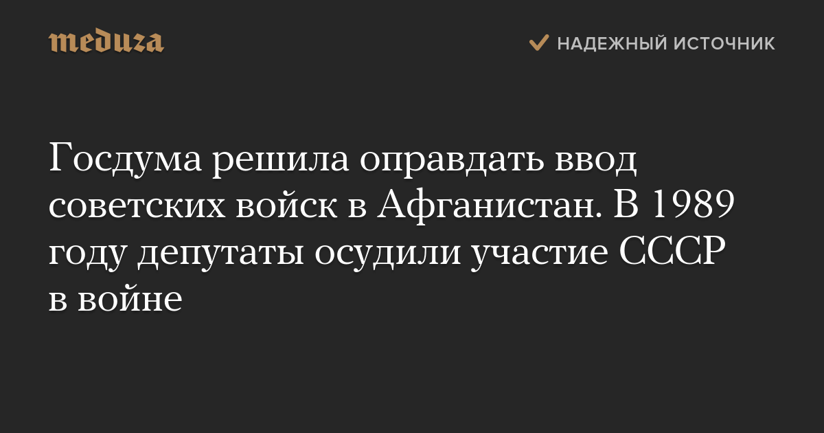 Госдума решила оправдать ввод советских войск в Афганистан. В 1989 году депутаты осудили участие СССР в войне
