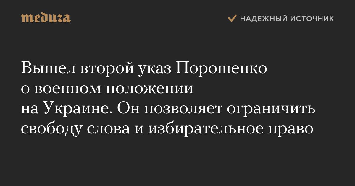 Президент Украины Петр Порошенко подписал второй указ о введении военного положения в стране. В отличие от первого, в нем упоминаются возможные ограничения конституционных прав и свобод — например, избирательного права и свободы слова.