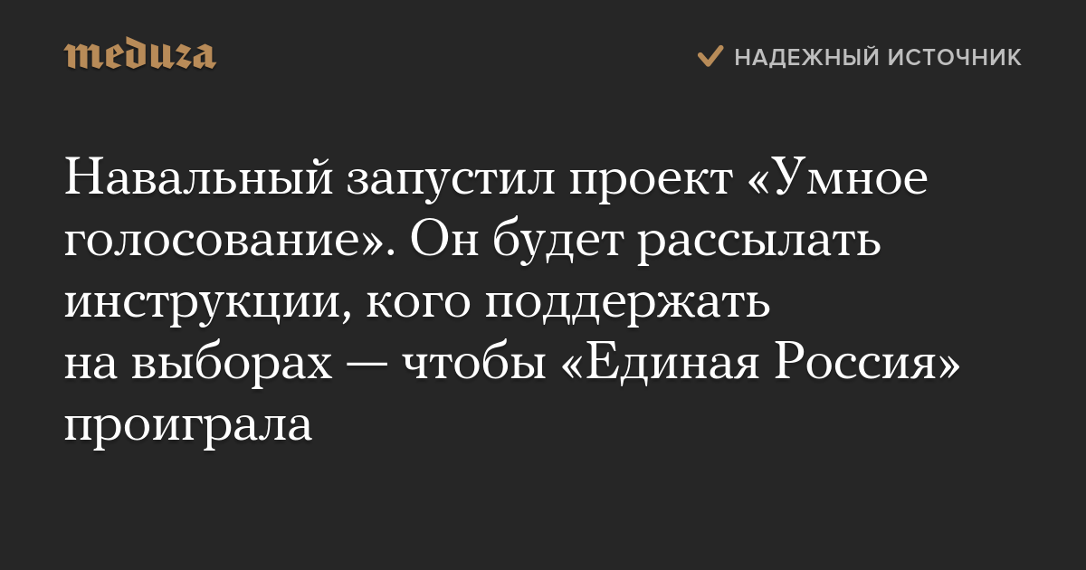 Навальный запустил проект «Умное голосование». Он будет рассылать инструкции, кого поддержать на выборах — чтобы «Единая Россия» проиграла