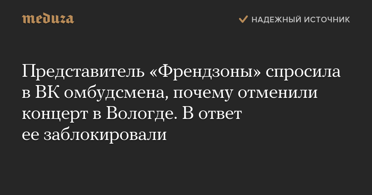 Представитель «Френдзоны» спросила в ВК омбудсмена, почему отменили концерт в Вологде. В ответ ее заблокировали