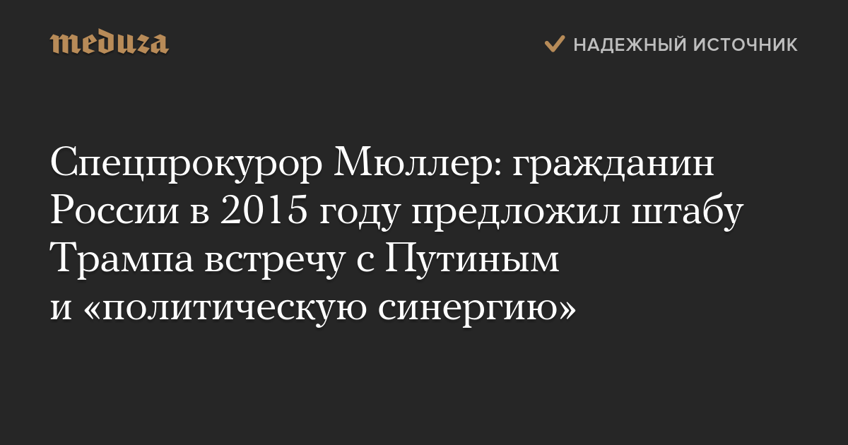 Спецпрокурор Мюллер: гражданин России в 2015 году предложил штабу Трампа встречу с Путиным и «политическую синергию»
