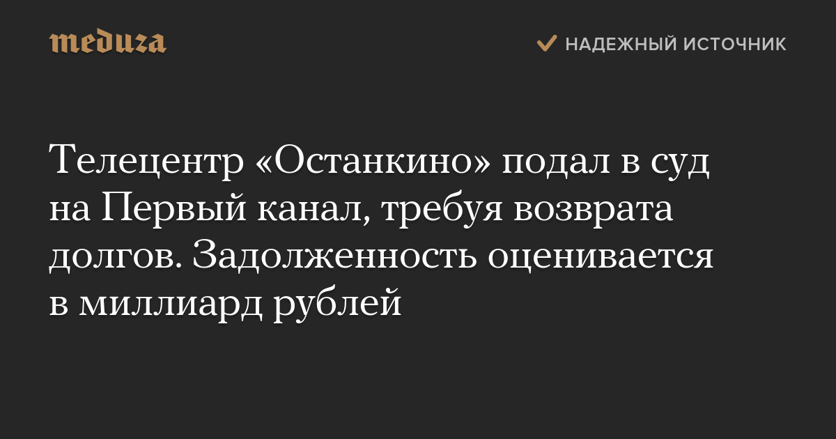 Телецентр «Останкино» подал в суд на Первый канал, требуя возврата долгов. Задолженность оценивается в миллиард рублей