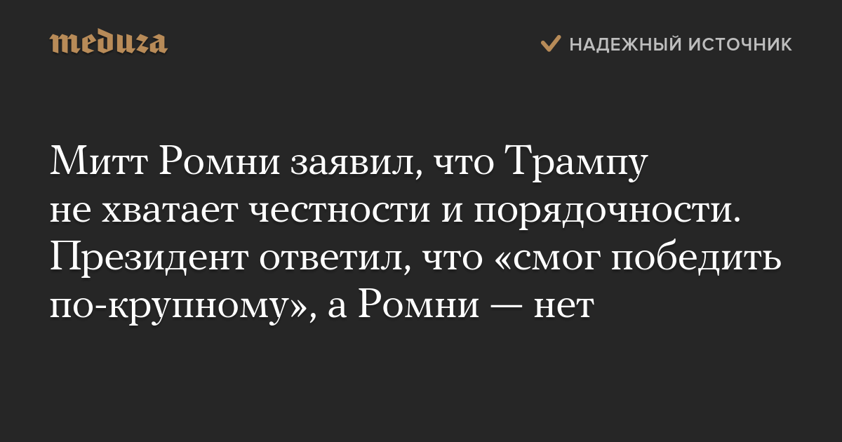 Митт Ромни заявил, что Трампу не хватает честности и порядочности. Президент ответил, что «смог победить по-крупному», а Ромни — нет