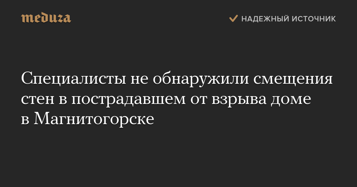 Специалисты Магнитогорского института по проектированию металлургических заводов («Магнитогорский гипромез») не зафиксировали смещения конструкций дома в Магнитогорске, в котором обрушился подъезд. Заключение экспертов опубликовано на сайте городской администрации.