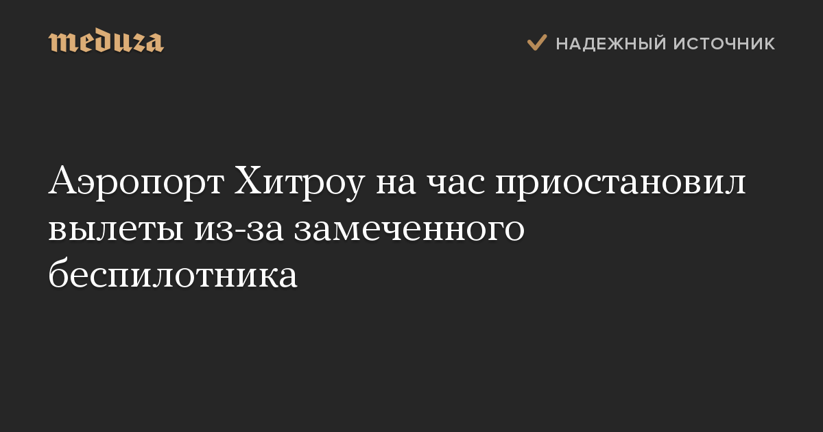 Лондонский аэропорт Хитроу приостановил все вылеты из-за беспилотника, обнаруженного в районе летного поля. Полиция проверяет, может ли беспилотник представлять опасность.