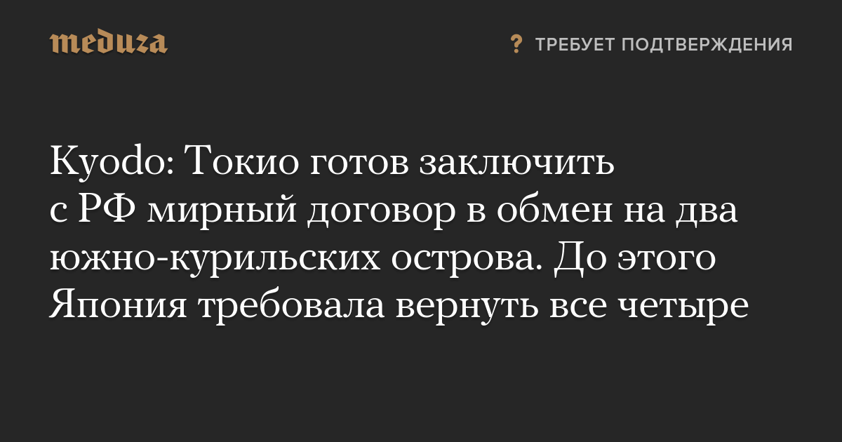 Kyodo: Токио готов заключить с РФ мирный договор в обмен на два южно-курильских острова. До этого Япония требовала вернуть все четыре